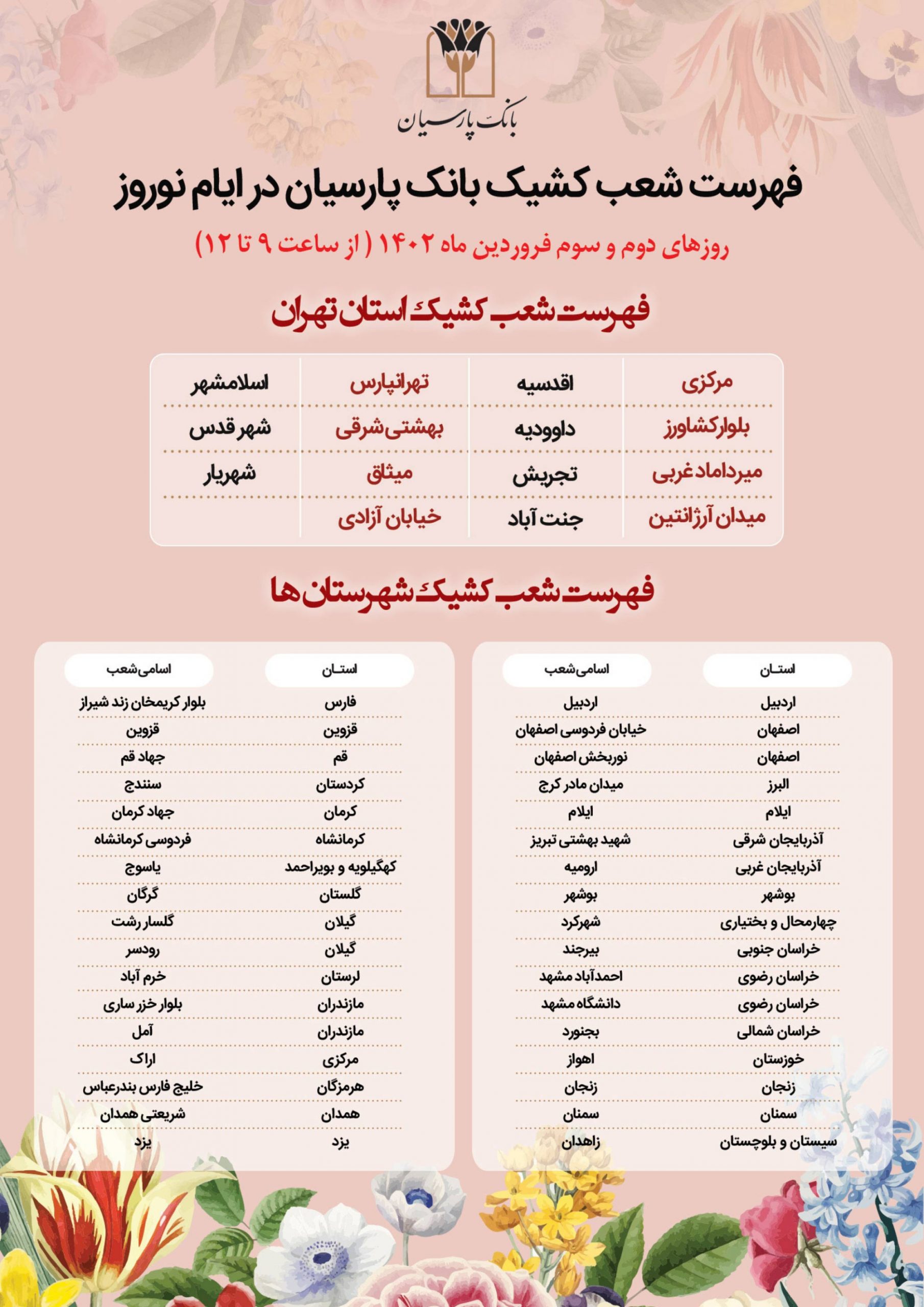 شعب کشیک نوروزی بانک پارسیان در سال 1404