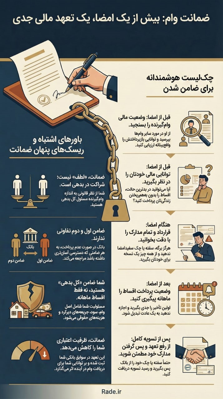 | تصمیمگیری اولیه پیش از ضمانت | بدون تعارف بپرسید: «آیا این اولین وامی است که میگیری؟ بقیه وامهایت در چه وضعیتی هستند؟» کسی که همزمان 5 جای دیگر قسط میدهد شاید ریسک بیشتری برای ضامن داشته باشد. | |