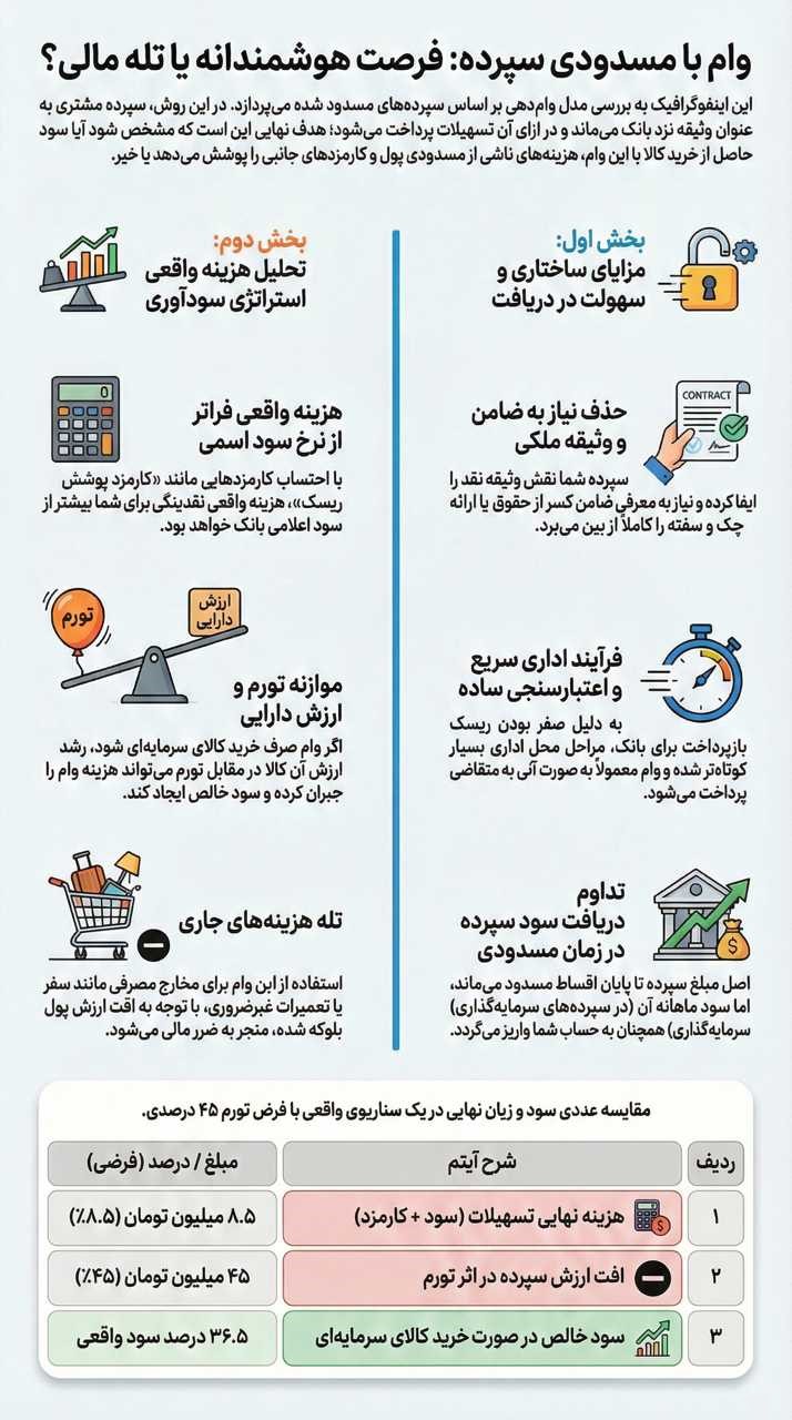 نکته مهم: این معامله فقط زمانی سودده است که وام صرف خرید دارایی یا کالای سرمایهای شود. صرف کردن این وام برای هزینههای جاری (مثل سفر یا تعمیرات غیرضروری) با توجه به کارمزد 6 درصدی، ضرر محسوب میشود.