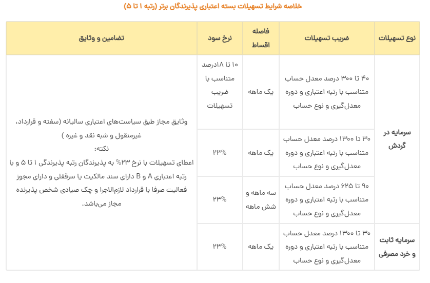 | نرخ سود وام | 23 ٪ نرخ سود براساس نوع تسهیلات (سرمایه در گردش و سرمایه ثابت) و ضریب تسهیلات بین 10 تا 23 درصد متفاوت است. |