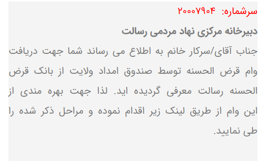 1- اعضایی که از صندوق امداد ولایت جهت دریافت وام قرض الحسنه به بانک قرض الحسنه رسالت معرفی شده اند، ابتدا پیامکی با محتوای زیر دریافت می‌کنند: